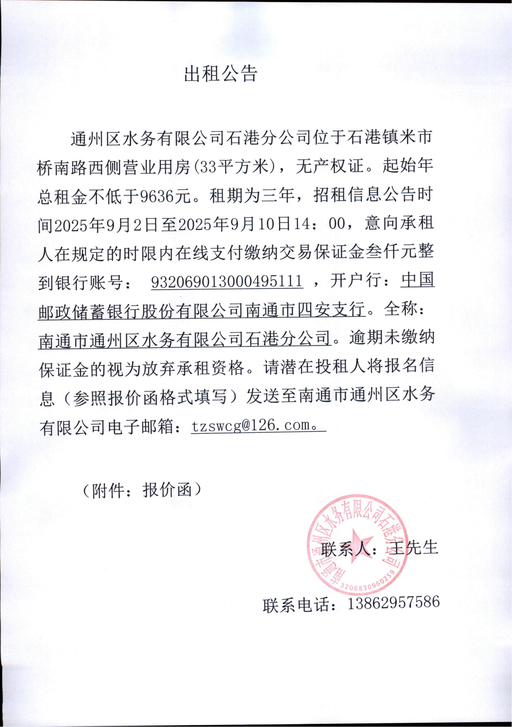 - 南通市通州區(qū)水務(wù)有限公司石港分公司米市橋南路西側(cè)營業(yè)用房(33平方米)出租公告2025-09-01